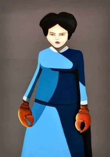 Her paintings introduce a world of robotic figures with an emotional touch. “In adult life we play and we parade…with masks. Would the children that we were, be satisfied with the adult that we have become?” she asks.
